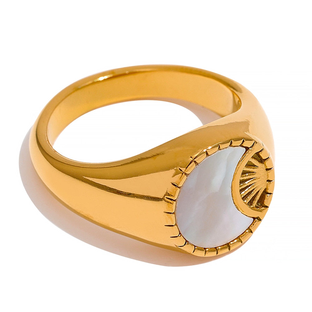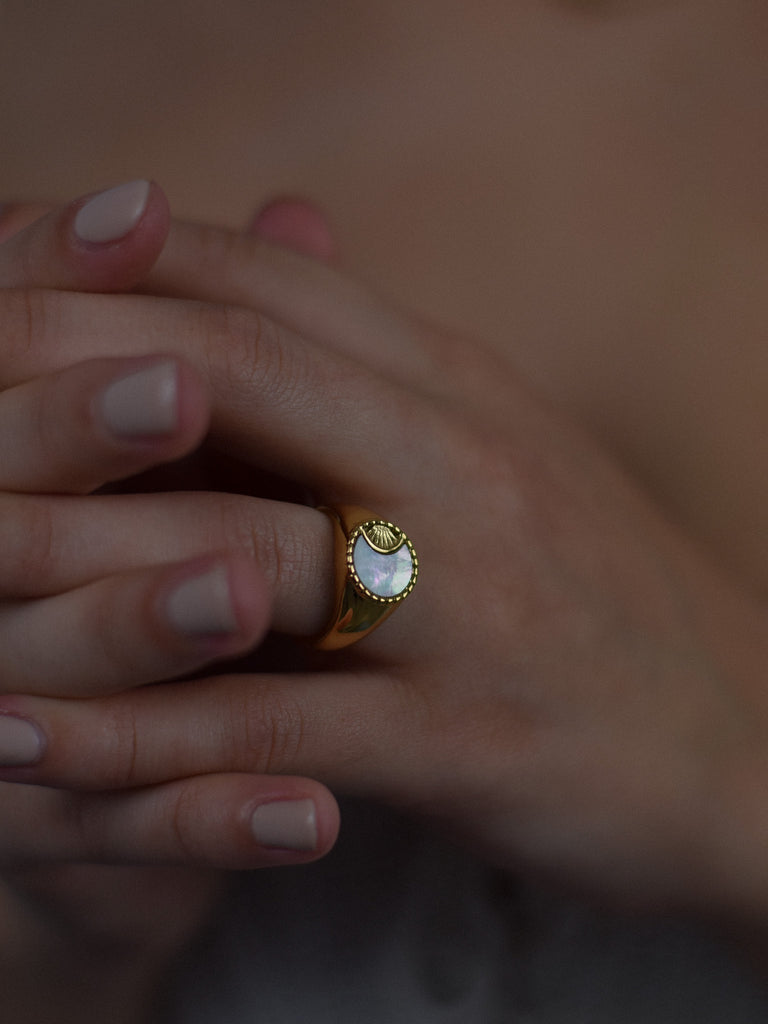 Hochwertige Ring aus 316L Edelstahl mit 18 Karat Vergoldung und bestückt mit edler Perlenmuschel