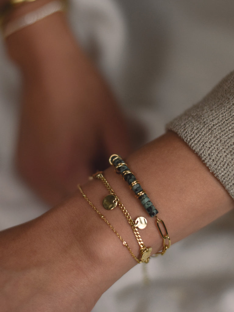 Hochwertiges handgemachtes Kombiarmband, aus 316L Edelstahl mit feiner 18 Karat Vergoldung und beschmückt mit Beads aus Naturstein.
