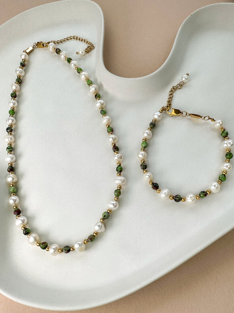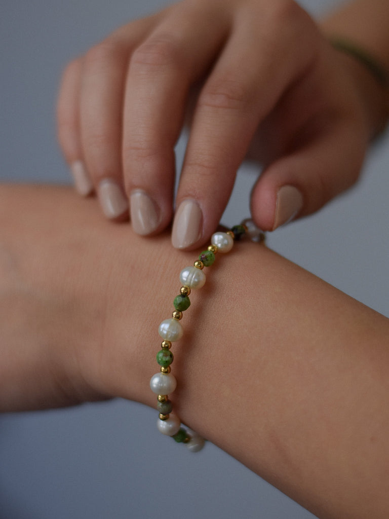 Hochwertiges Beadsarmband aus 316L Edelstahl, überzogen mit echter 18 Karat Vergoldung und bestückt mit edlen Süßwasserperlen und Naturstein